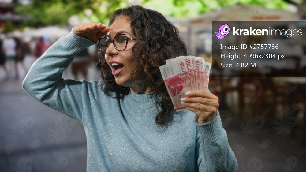 Woman outdoors in city street gestures while holding icelandic banknotes, wearing glasses and a blue sweater with a joyful expression, suggesting financial success and excitement. - Kraken Images