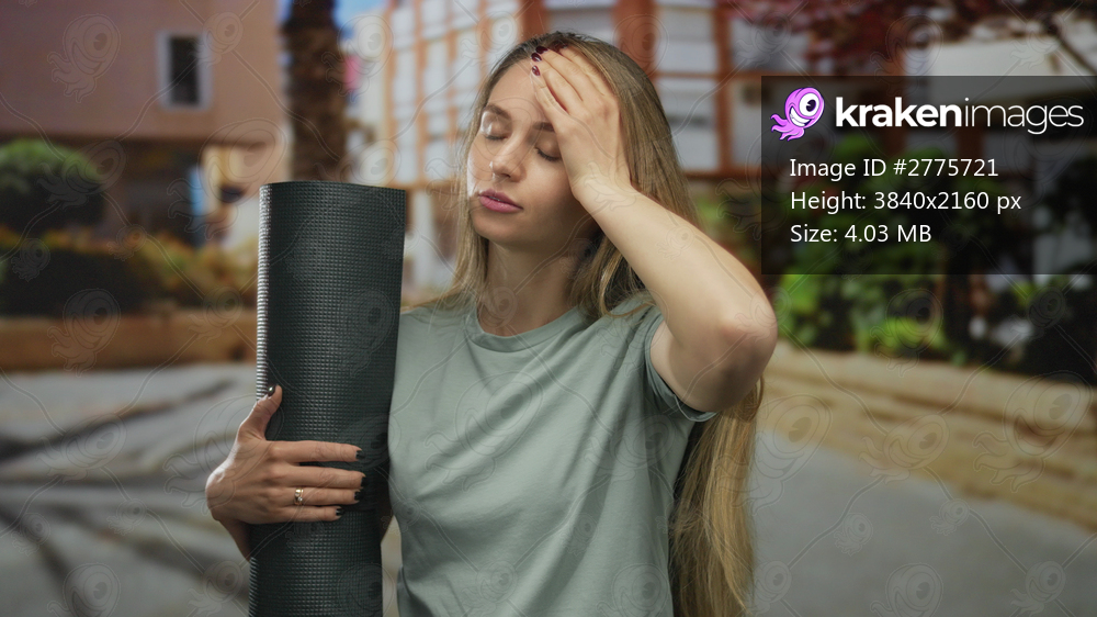 Woman outdoors in city street holding yoga mat appearing tired with hand on forehead against urban background in daylight