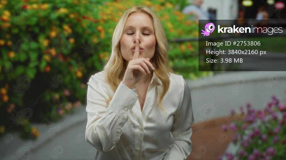 Woman outdoors in city street making hush gesture wearing white blouse surrounded by vibrant flowers and green foliage creating serene scene during daylight. - Kraken Images