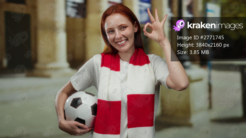 Woman outdoors in city street, red hair holding soccer ball, making ok gesture, wearing red and white scarf, smiling brightly in casual clothing with blurred background. - Kraken Images