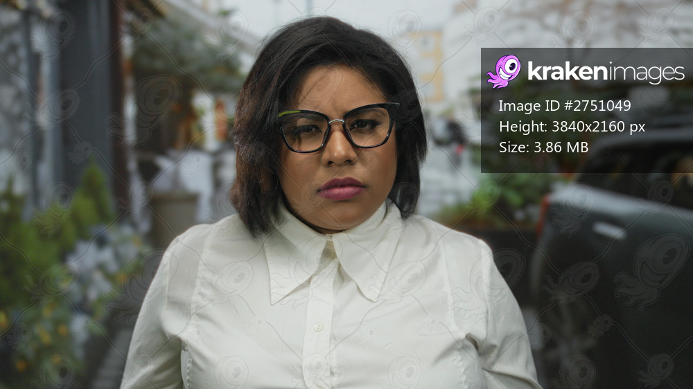Woman outdoors in city street, wearing glasses and white shirt, looks thoughtful and contemplative with blurred urban background.