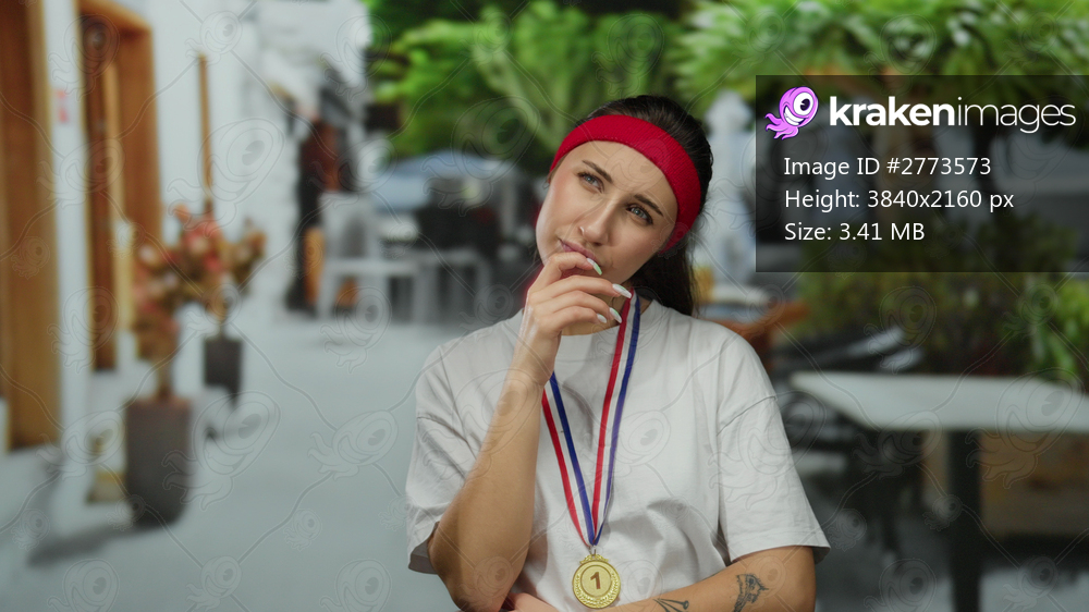 Woman outdoors in city street wearing medal and red headband thinking with urban background, embodying sporty and contemplative mood on a sunny day.