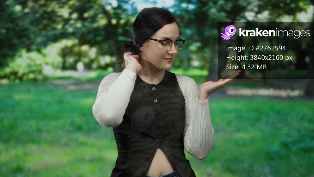 Woman outdoors in park presenting something with hand against green natural background suggesting tranquility and nature with a smile and casual attire. - Kraken Images