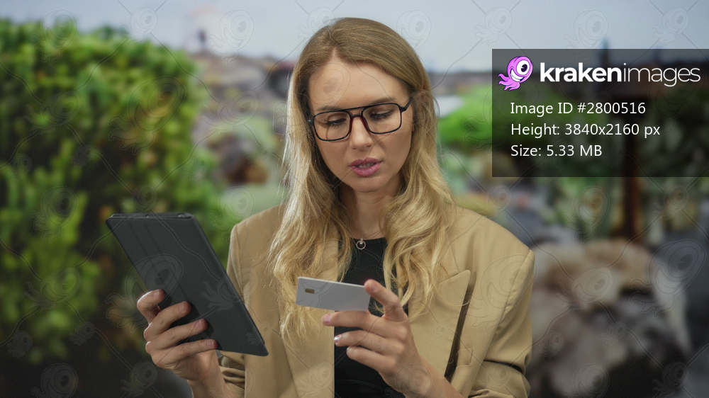 Woman outdoors in park using tablet and card, young blonde caucasian female in glasses focused on screen, surrounded by greenery suggesting online shopping or mobile banking. - Kraken Images