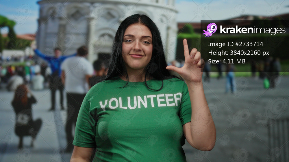 Woman outdoors in pisa making a playful gesture at the camera with the leaning tower in the background, wearing a volunteer shirt.