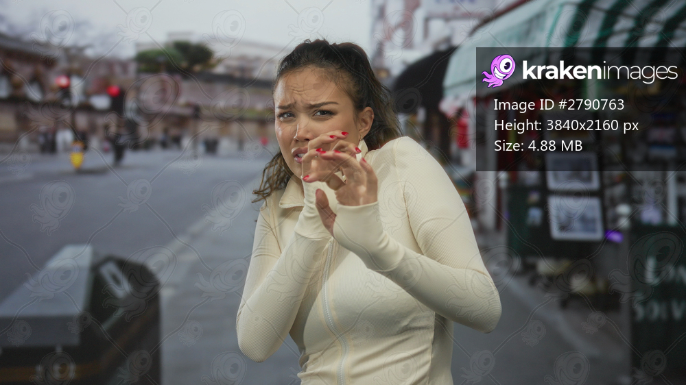 Woman outdoors in urban street showing a frightened expression with a busy market background suggesting a lively vibrant setting.