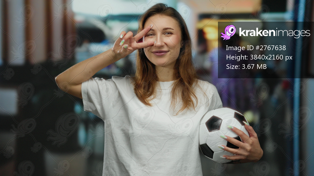 Woman outdoors laughing holding a soccer ball on a busy city street, demonstrating peace sign with a cheerful expression.