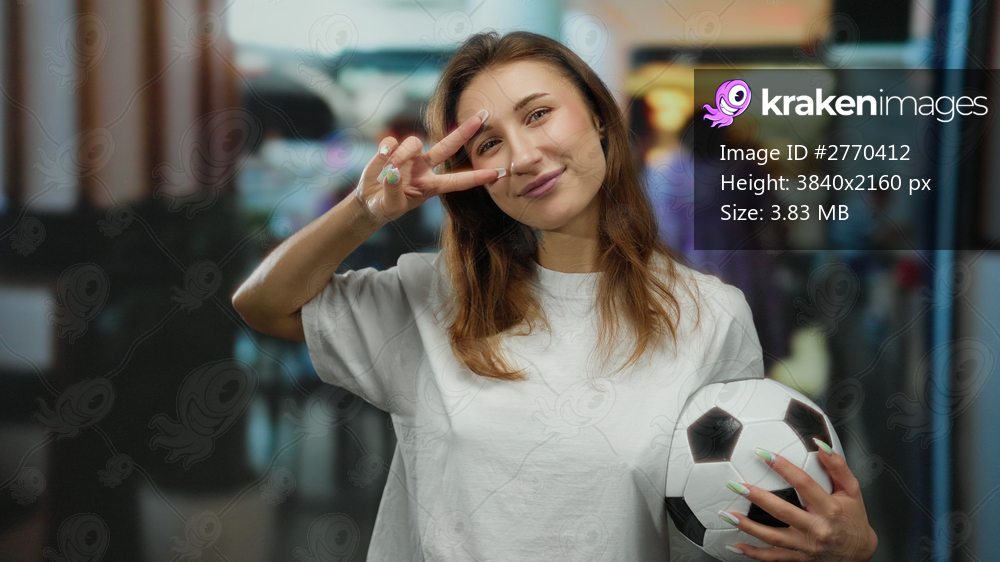 Woman outdoors laughing holding a soccer ball on a busy city street, demonstrating peace sign with a cheerful expression.