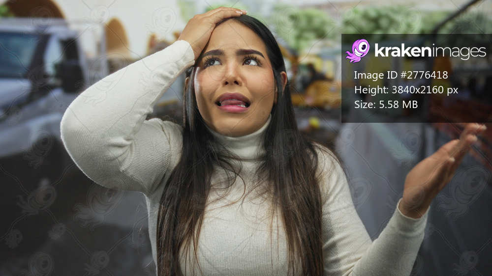 Woman outdoors with long hair looking frustrated on a street with vehicles and buildings in the background.