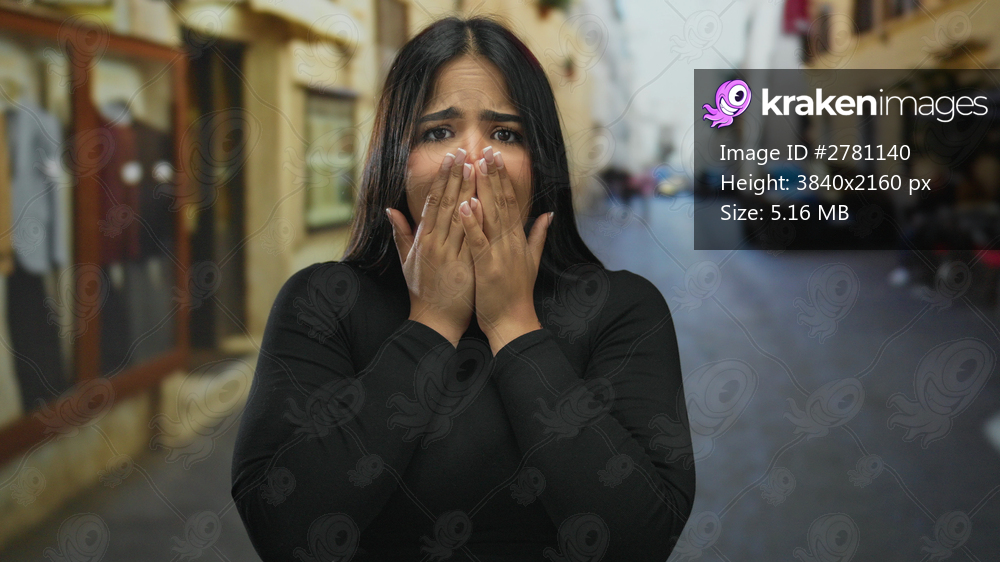 Woman outdoors looking worried with hands on chest in a busy street, expressing emotion in a city environment.