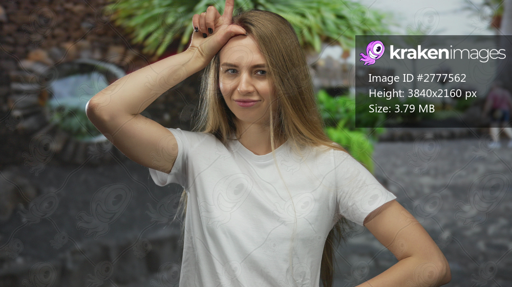 Woman outdoors making loser gesture while smiling in a casual setting with a playful and joyful expression against a lush garden backdrop.
