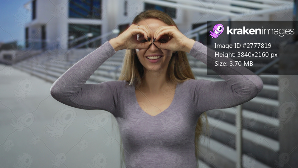 Woman outdoors mimicking binoculars with hands on stairs background smiling building.