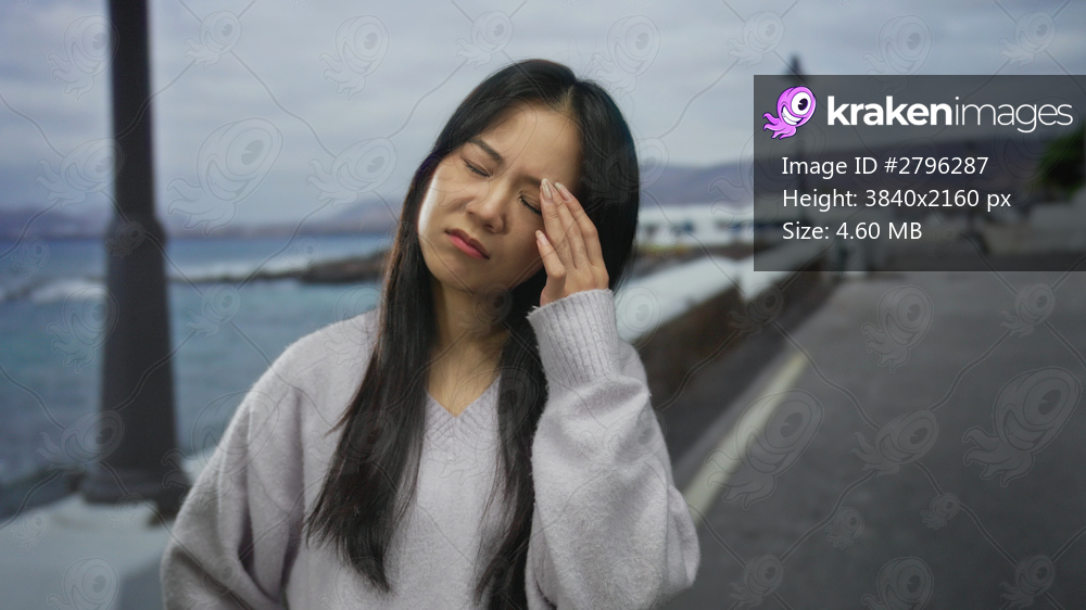 Woman outdoors on a seaside promenade looking pensive on a cloudy day with waves crashing, long hair blowing and lampposts lining the scenic beach promenade. - Kraken Images