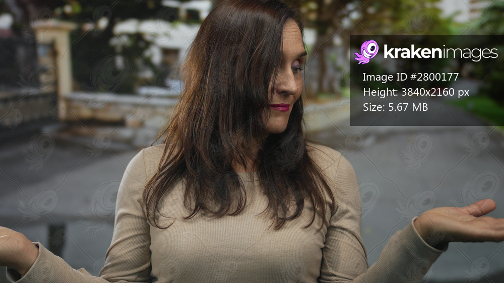 Woman outdoors on a street with a shrugging gesture, expressing uncertainty with a playful expression, surrounded by nature in a casual setting, reflecting indecisive emotions. - Kraken Images