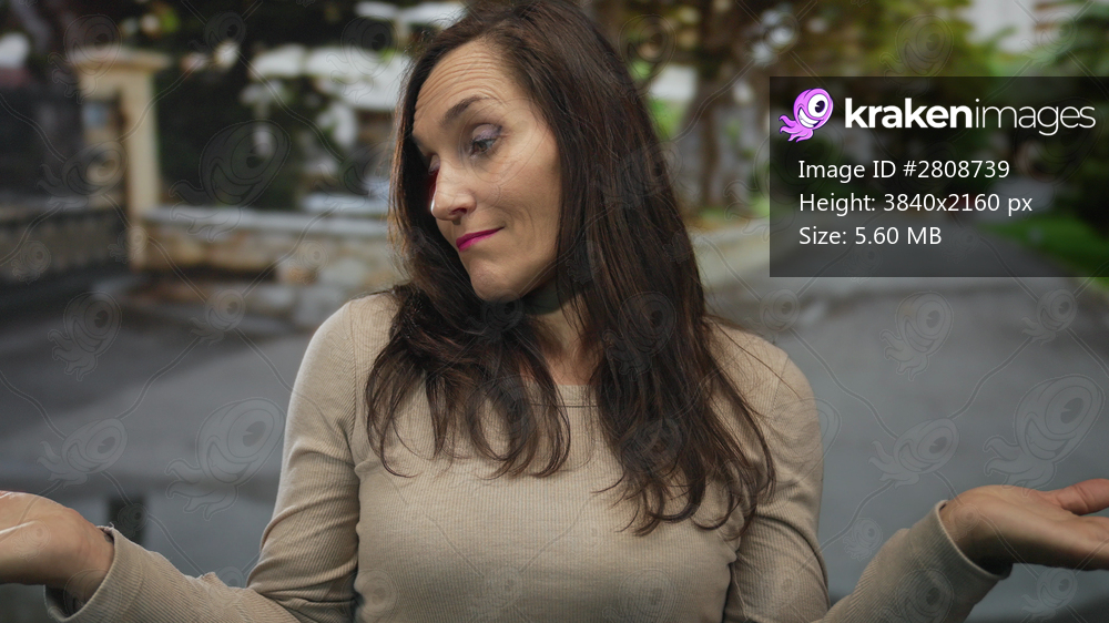 Woman outdoors on a street with a shrugging gesture, expressing uncertainty with a playful expression, surrounded by nature in a casual setting, reflecting indecisive emotions. - Kraken Images