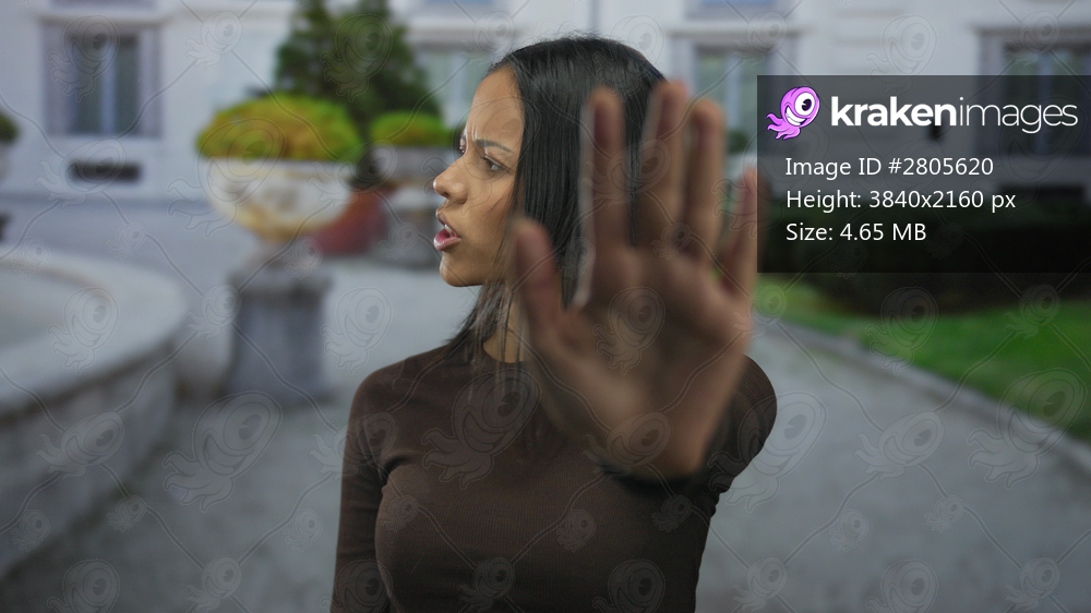 Woman outdoors on a street holds a hand up signaling stop while standing in front of an elegant garden setting with greenery and stone features.