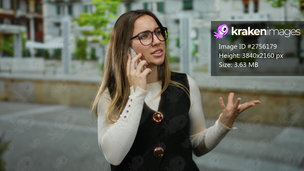 Woman outdoors on street appearing annoyed while talking on smartphone, wearing glasses and dark vest, surrounded by urban buildings and greenery.