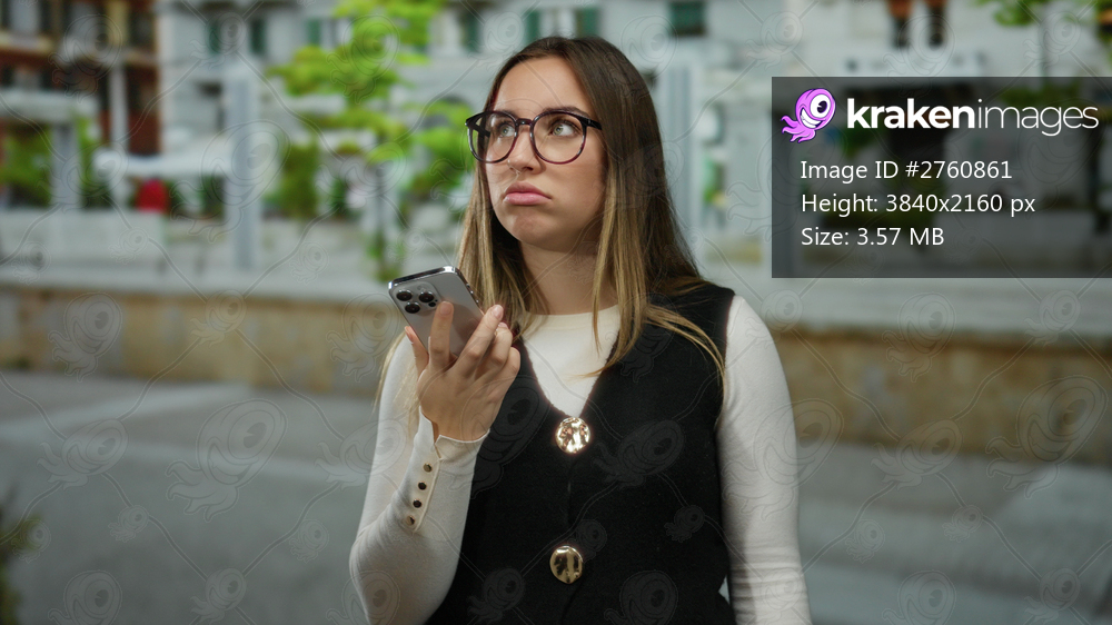 Woman outdoors on street appearing annoyed while talking on smartphone, wearing glasses and dark vest, surrounded by urban buildings and greenery.