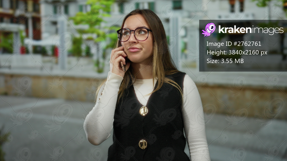 Woman outdoors on street appearing annoyed while talking on smartphone, wearing glasses and dark vest, surrounded by urban buildings and greenery.