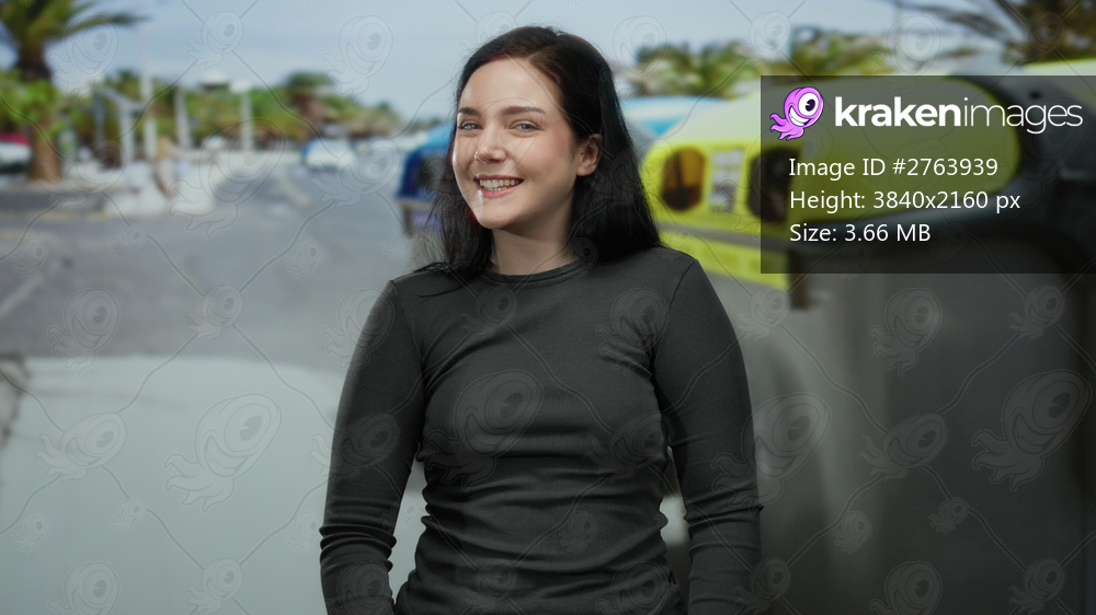 Woman outdoors on street with brunette hair wearing casual clothes expressing emotions against blurred urban background with recycling bin visible in the setting. - Kraken Images