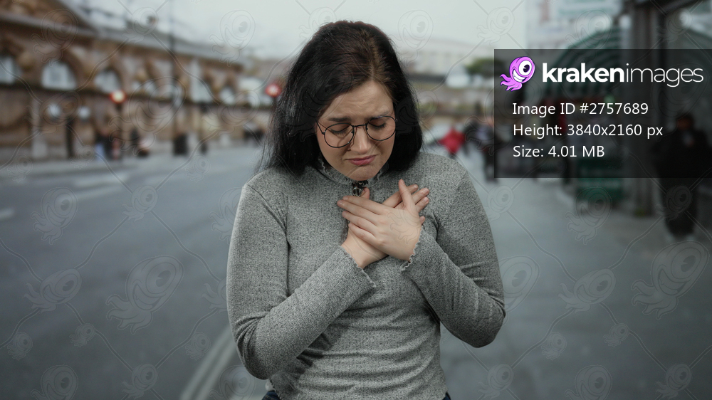 Woman outdoors on street clutching chest in emotional expression on urban background with blurred pedestrians.