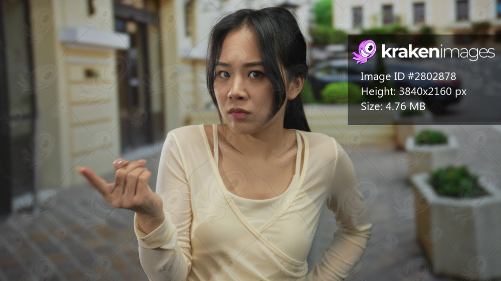 Woman outdoors on street displaying a determined expression in a vibrant cityscape, embodying confidence and focus in a bustling urban environment.