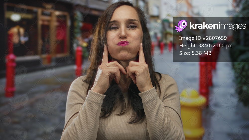 Woman outdoors on street gesturing with cheeky expression surrounded by vibrant urban scenery and red posts.