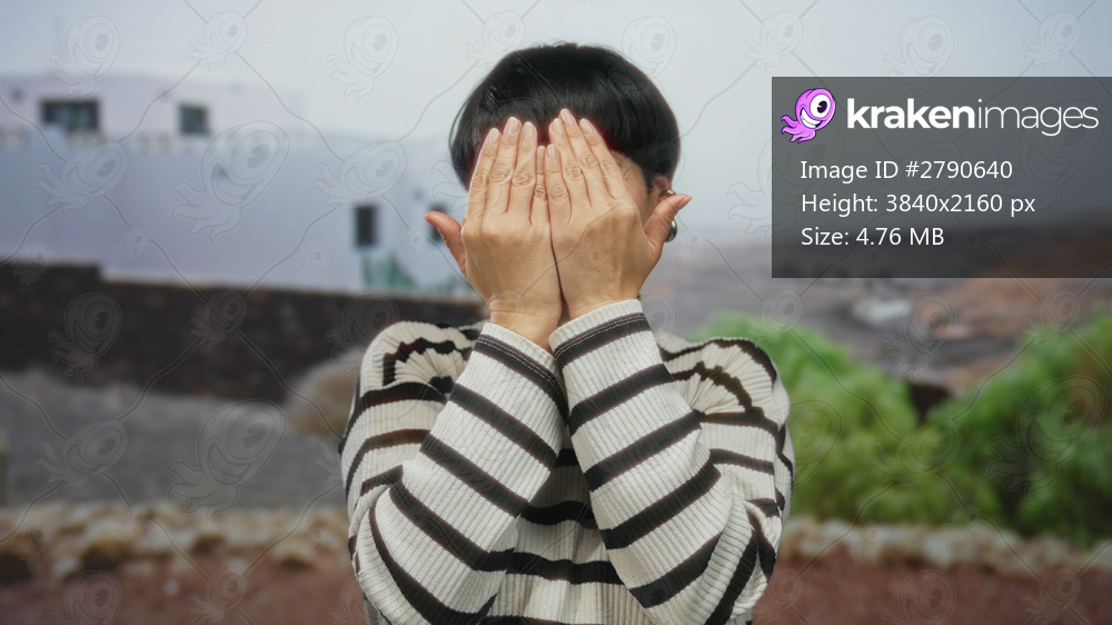 Woman outdoors playfully covering her face and sticking out tongue, wearing striped sweater with blurred natural and white building background indicating fun scenic environment. - Kraken Images
