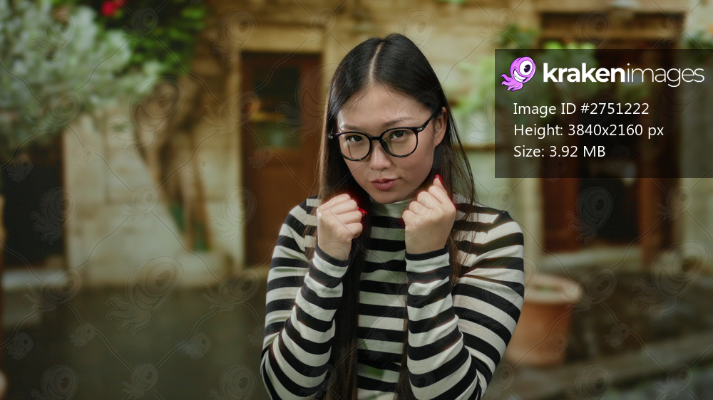 Woman outdoors with raised fists in an urban setting, wearing glasses and striped shirt, showcases confidence and strength in a city environment.