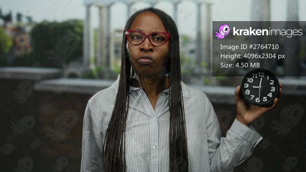 Woman outdoors with red glasses holds clock showing time against urban city backdrop.