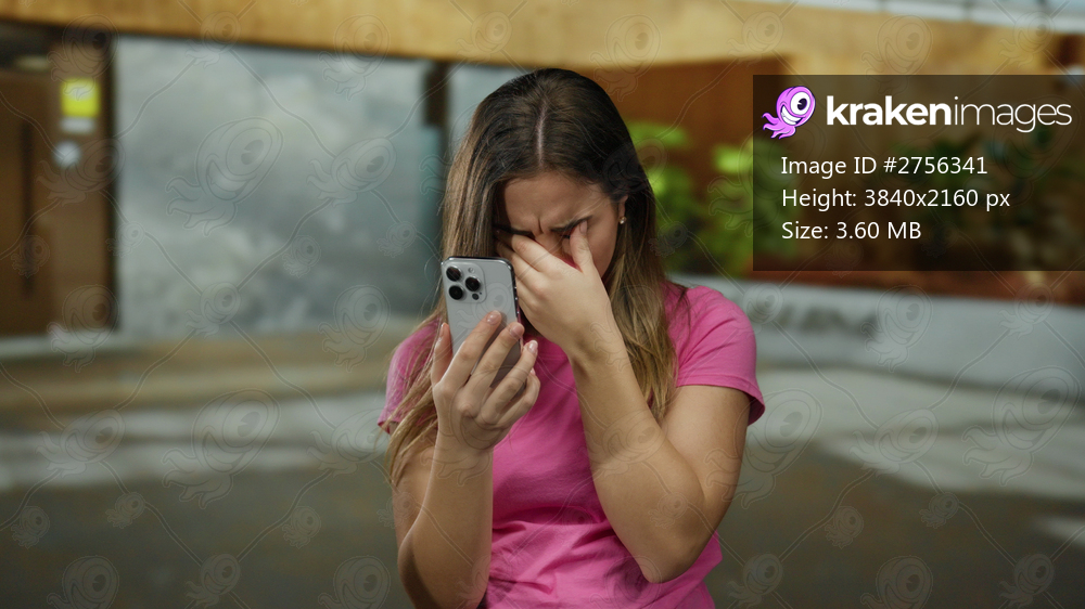 Woman outdoors showing frustration on street holding smartphone, displaying emotions against an urban backdrop.