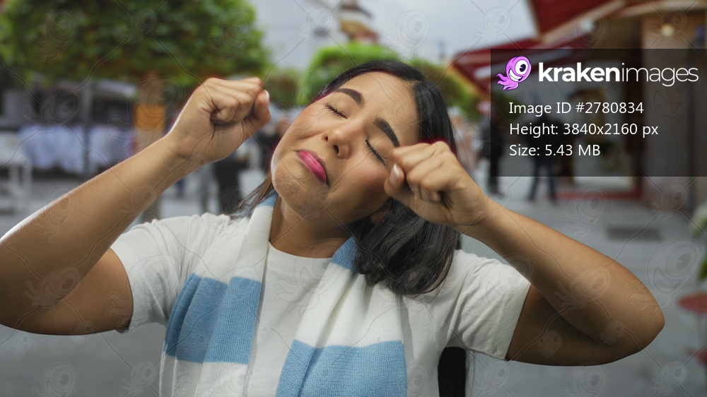 Woman outdoors showing sad expression on street, wearing scarf and t-shirt, surrounded by urban environment and trees, conveying emotions in a lively setting. - Kraken Images