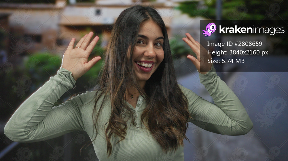 Woman outdoors smiling with hands raised in excitement against a blurred backdrop, showcasing a cheerful young hispanic woman expressing joy in a natural setting. - Kraken Images