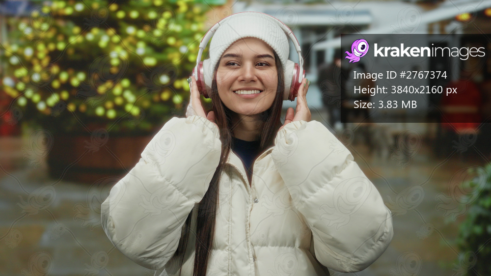 Woman outdoors smiling in winter coat wearing headphones near festive lights on street with background of blurred people and cafe creating a joyful urban atmosphere. - Kraken Images