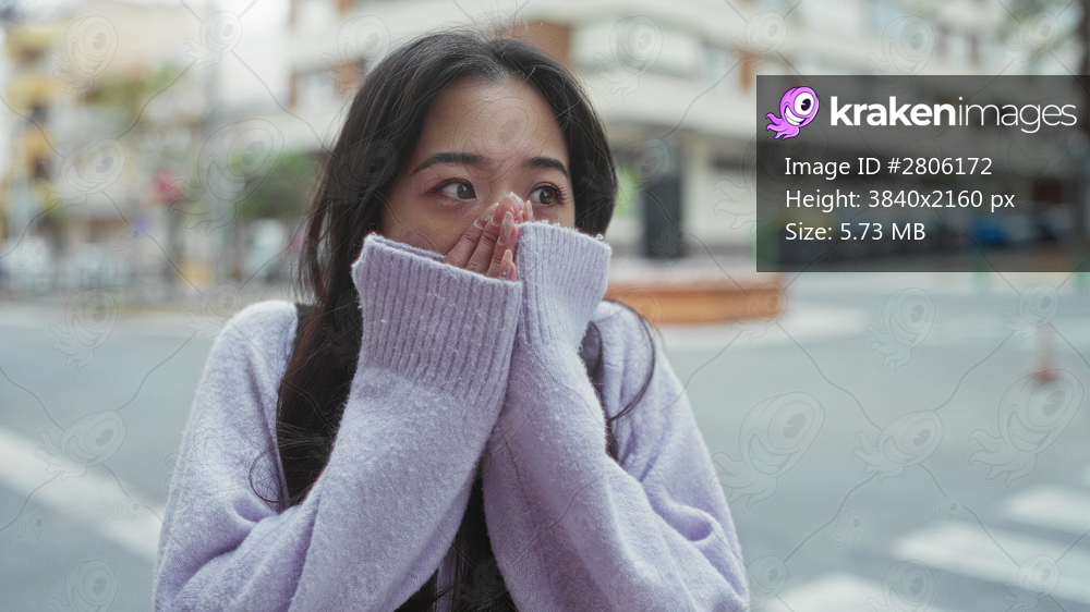 Woman outdoors surprised street urban city expression emotion sweater asian pedestrian shock