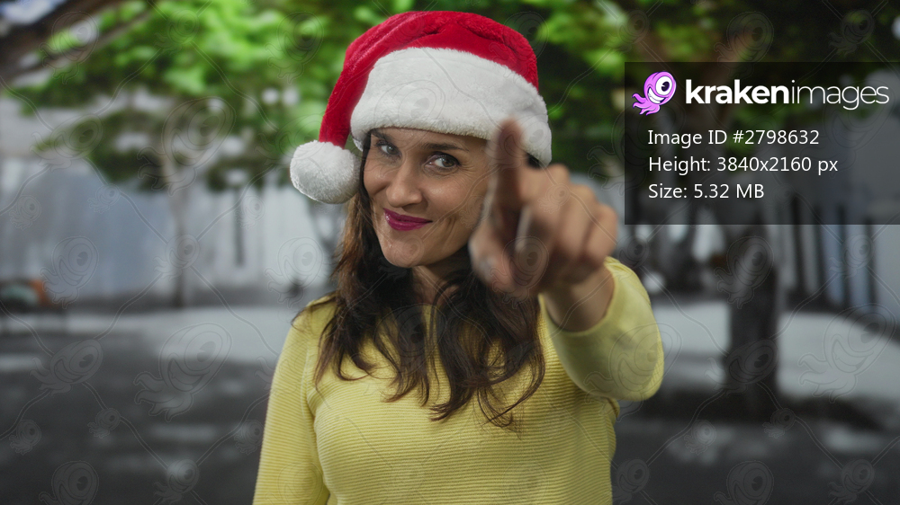 Woman outdoors wearing a santa hat and yellow sweater, smiling and making a heart with her hands, conveying festive cheer in a bright outdoor setting.