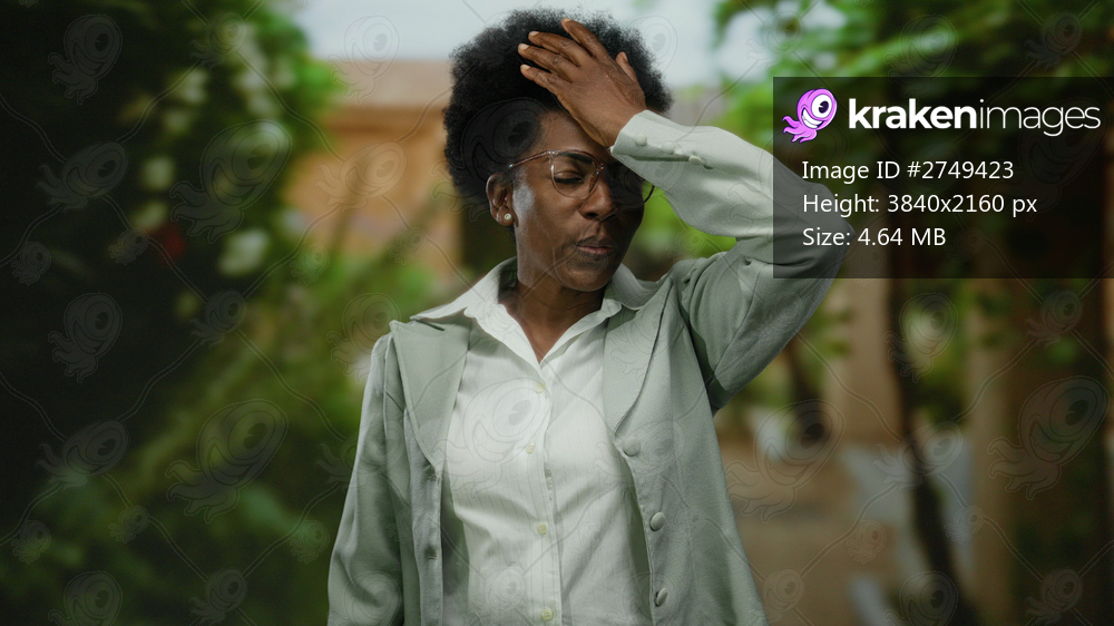 Woman outdoors wearing glasses appears surprised with hand on head in a vibrant city street setting, capturing a moment of unexpected emotion and curiosity. - Kraken Images
