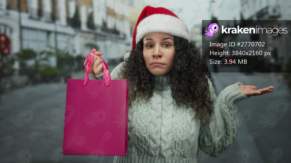 Woman outdoors wearing santa hat holding shopping bag on street during holiday season