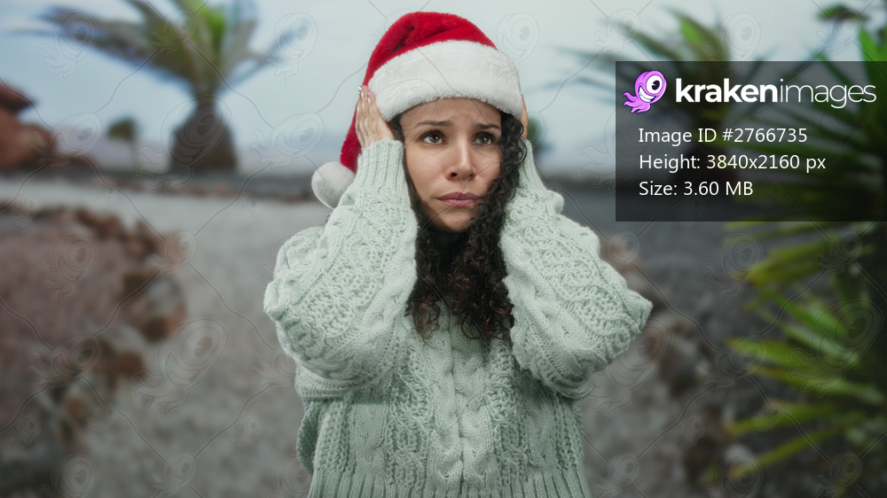 Woman outdoors wearing santa hat in desert, holding head in frustration, surrounded by palm trees, expressing stress during holiday season.
