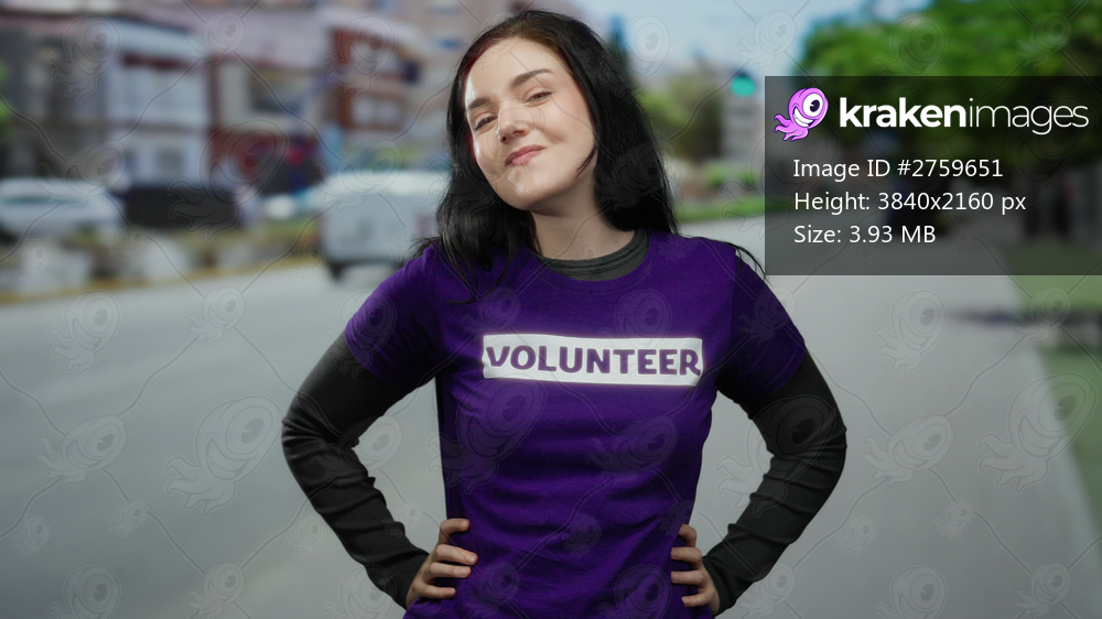 Woman outdoors wearing volunteer t-shirt smiling on a bright day surrounded by urban street scenery and greenery looking confident and determined as she stands on the sidewalk. - Kraken Images