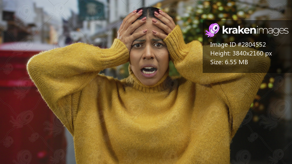 Woman outdoors wearing yellow sweater looks distressed standing on street with hands on head conveying emotion during daytime.