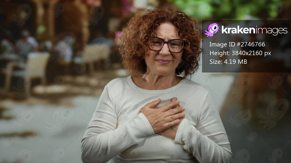 Woman outside holding chest with expression on outdoor terrace restaurant during day with blurred people and tables in background wearing glasses and casual wear conveying emotion - Kraken Images