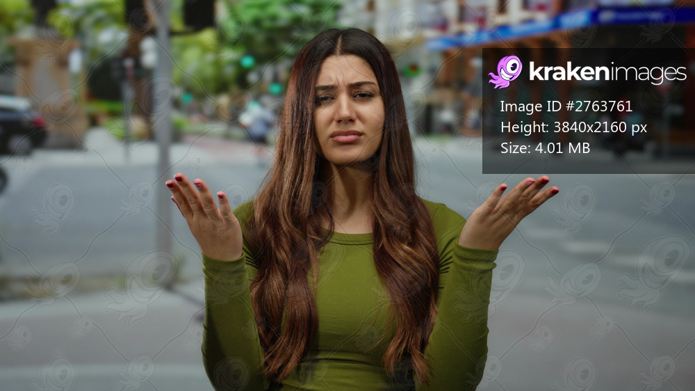 Woman outside looking perplexed on a bustling city street with busy traffic and blurred background, expressing confusion with raised hands and long wavy hair. - Kraken Images