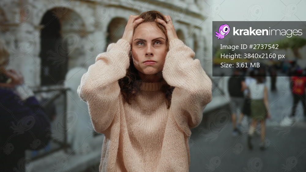 Woman outside roman coliseum looking stressed in busy city street wearing sweater on a bright day.