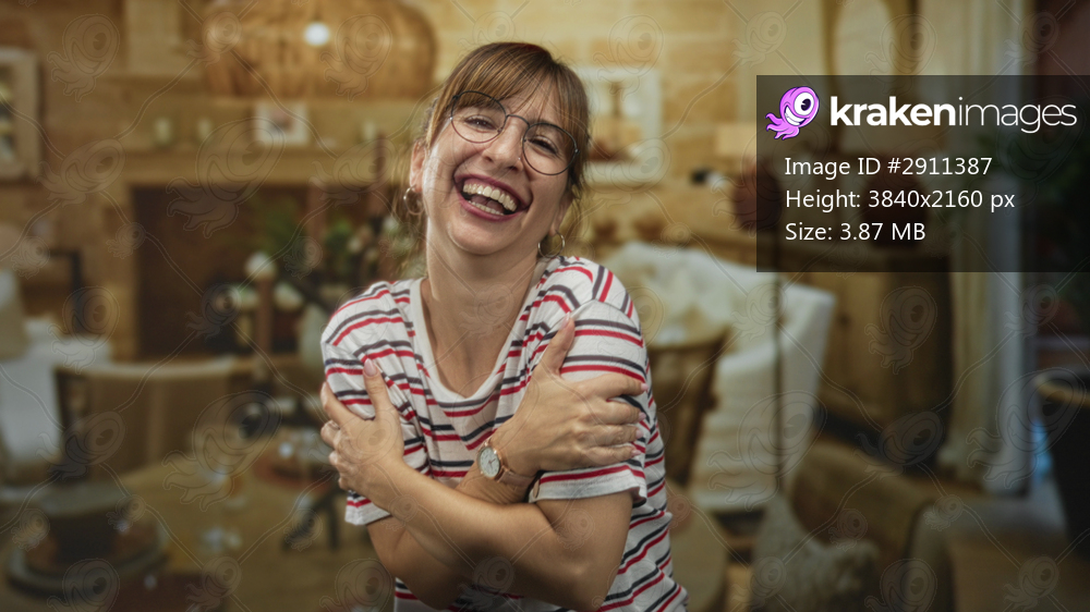 Woman with outstretched hands reaching forward in building living room, smiling and offering a hug; joy welcome.