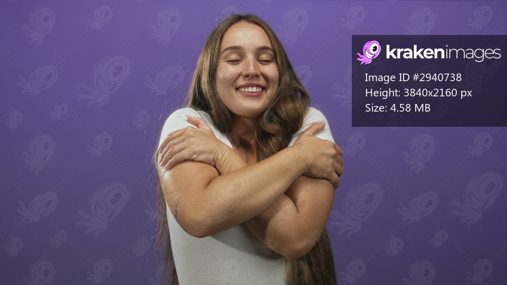 Woman with outstretched hands reaching to camera in purple studio, smiling broadly and offering an open embrace; joy connection.