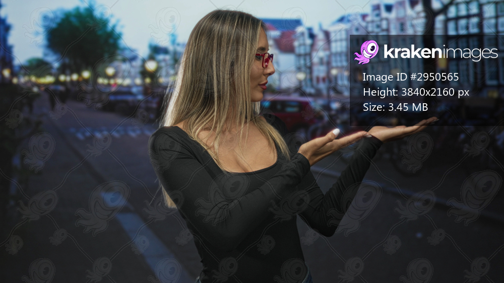 Woman with outstretched palms and red glasses on a city street, sideways profile presenting both hands as if offering an object, wearing black long sleeve top; warm curiosity. - Kraken Images