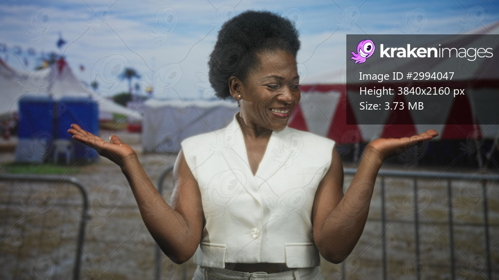 Woman with outstretched palms smiling, hands visible, wearing white vest in front of carnival tents at a street fair; joy confidence celebration.