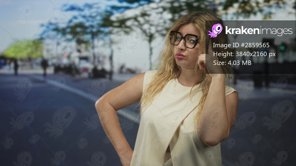 Woman with oversized glasses and blonde hair, touching temple and hand on hip, wearing sleeveless cream top, standing in daylight on busy city street with blurred pedestrians and trees; skepticism. - Kraken Images