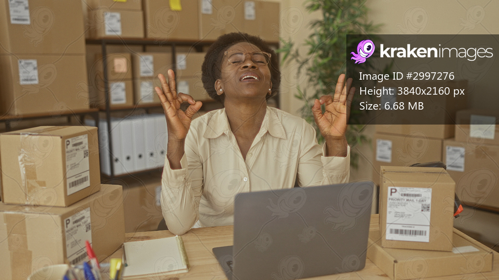 Woman owner at desk with laptop, stacked shipping boxes and labels, eyes closed while making ok hand gesture in building; relief success.